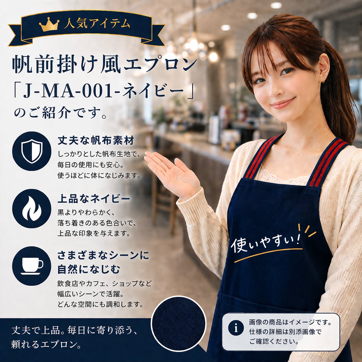 帆前掛け風エプロン「J-MA-001-ネイビー」のご紹介です。