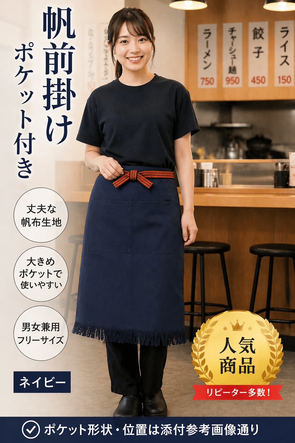 帆前掛け ポケット付き 無地 ロング ネイビー 男女兼用 エプロン 飲食店 居酒屋 ユニフォーム 業務用 前掛け NOB-26046
